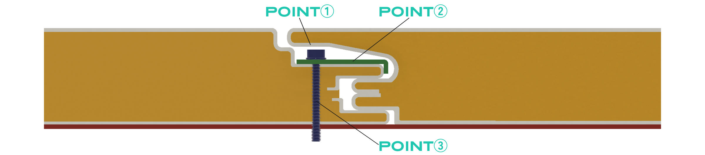 折れにくく粘り強い高靱性ねじを採用し、1箇所あたり2本での留付けを標準仕様としています。これにより、局所的な荷重や振動に対する耐久性が向上し、長期にわたる安全性と安定した固定力を確保。万一の外力や経年変化にも強い、信頼性の高い留付け構造です。